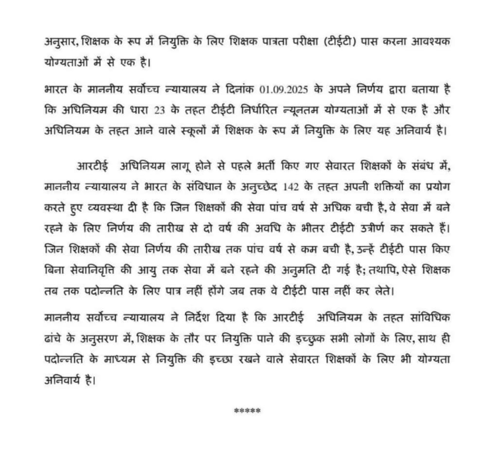 सरकार के अनुसार जिन शिक्षकों की सेवा में 5 साल से अधिक समय बाकी है, उन्हें फैसले की तारीख से दो साल के अंदर टीईटी पास करना जरूरी होगा। अगर कोई शिक्षक तय समय में परीक्षा पास नहीं करता है, तो उसे आगे चलकर परेशानी का सामना करना पड़ सकता है। वहीं जिन शिक्षकों की सेवा पांच साल से कम बची है, वे बिना टीईटी पास किए सेवा में बने रह सकते हैं, लेकिन उन्हें पदोन्नति का लाभ नहीं मिलेगा। इस नियम के बाद शिक्षकों के बीच तैयारी को लेकर चर्चा तेज हो गई है।